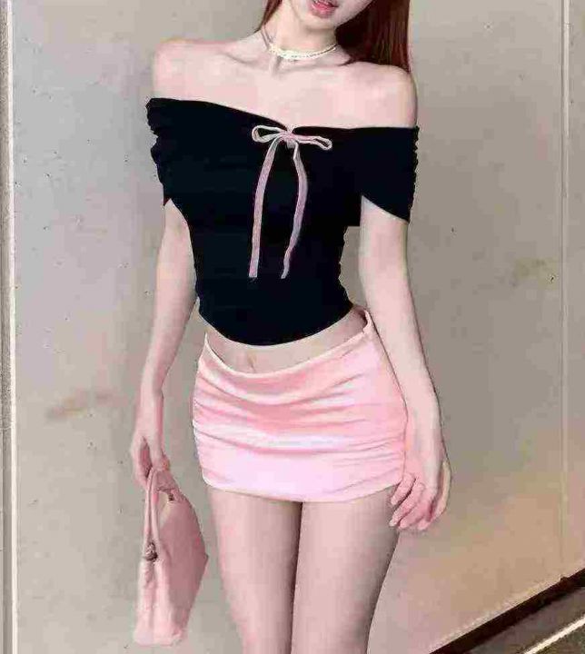 甜欲棉质辣妹一字领上衣599件7.8面料柔软有弹力,绑带蝴蝶结,褶皱设计,码...