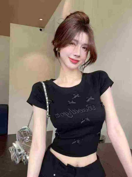 ☕️韩系甜美字母刺绣短袖t恤别致绝美修身显瘦纯欲蝴蝶工艺上衣600件全清8....