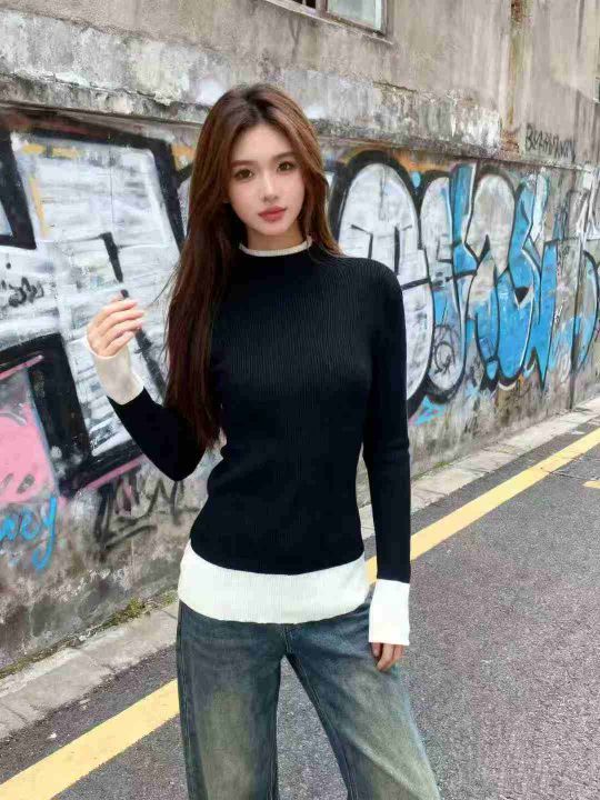包芯纱半高领套头撞色打底针织毛衣,品质好独立包装,M L码,主色黑蓝色白...
