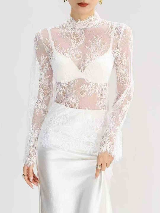 270件半高领白色蕾丝网纱打底衫内搭叠穿绝美花边透明上衣女轻奢高级感,质...