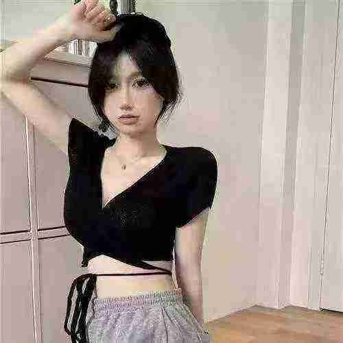 夏季辣妹心机甜辣短款修身短袖v领交叉美背系带冰丝针织上衣,独立包装,240...