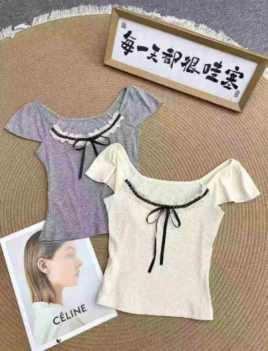 法式蕾丝拼接短袖499件6.5,面料柔软有弹力,蝴蝶结蕾丝花边,码数1-4码(S...