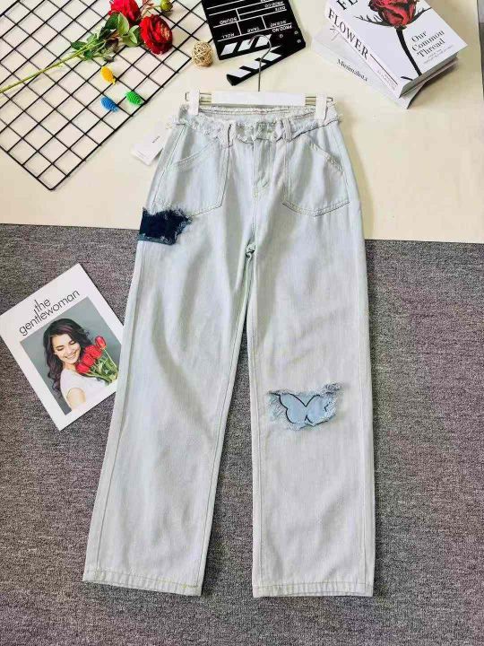 天猫精选2200条 时尚洋气国潮蓝色蝴蝶刺绣毛边阔腿牛仔裤女,单款单色S~XL...