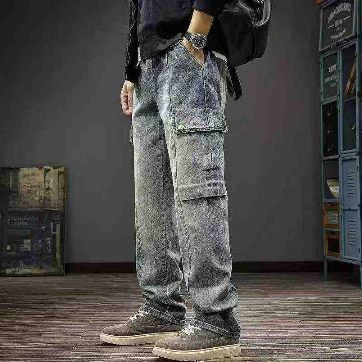 春季新款潮牌美式复古拼接大码男士水洗做旧耐磨宽松直筒多袋工装牛仔裤,独...