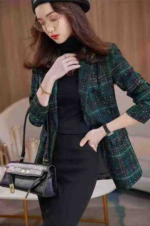 全清价16.8元捡漏35件复古洋气绿色气质闪闪格子中长款时尚修身西装外套,独...