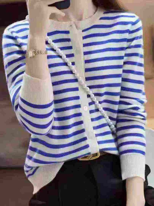 春秋长袖针织开衫毛衣百搭显宽松条纹撞色外套上衣,170件,包芯纱面料,厚...