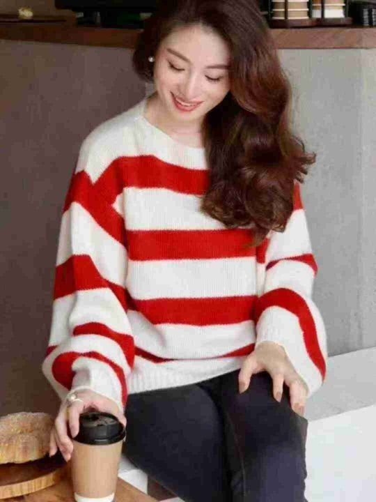 女装秋冬款复古撞色条纹ins港风大版厚重宽松毛衣针织衫上衣,独立包装,均...
