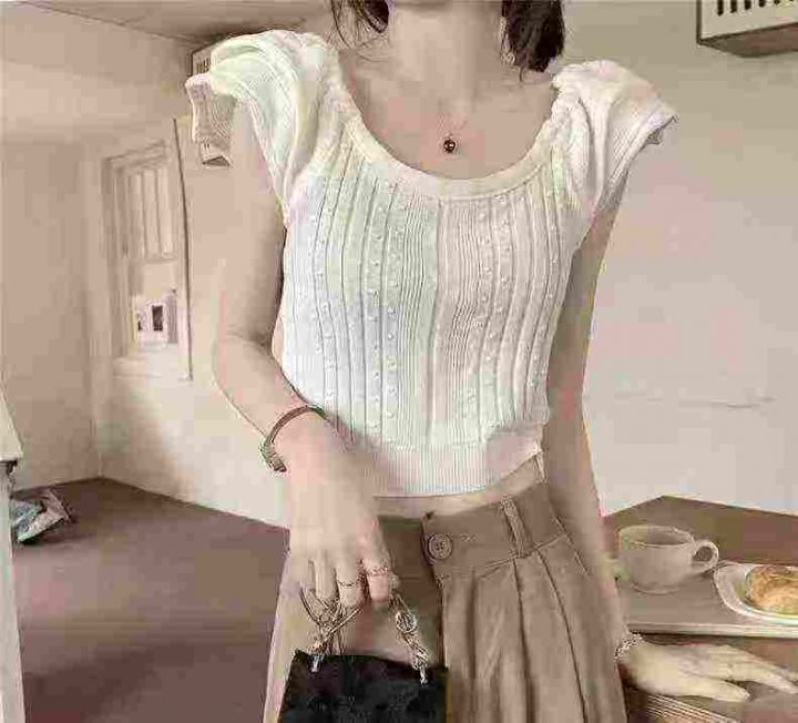 一字领泡泡短袖针织衫法式设计感小众性感短款毛衣露肩上衣,独立包装,均码...