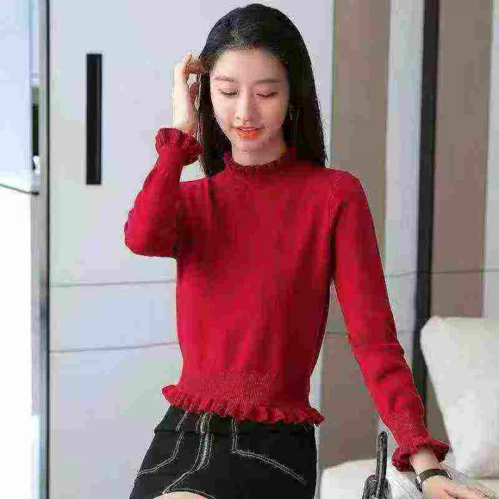 包芯纱收腰木耳边打底毛衣长袖半高领2025年秋冬内搭修身针织毛衫,独立包装...