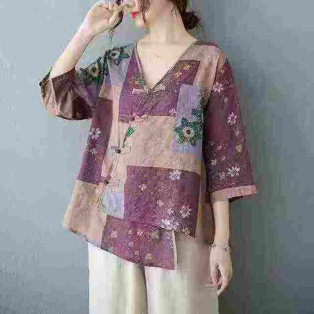 复古新款宽松洋气盘扣T恤大码女装 ,数量:106件,码数:(1-4)S-M-L-XL,...