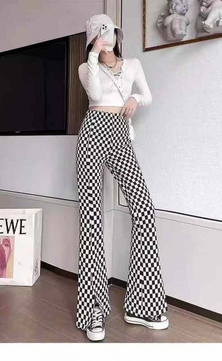 棋盘格子喇叭裤529件8.5,面料微弹,松紧腰,裤脚开叉,码数M-L,独立包装...