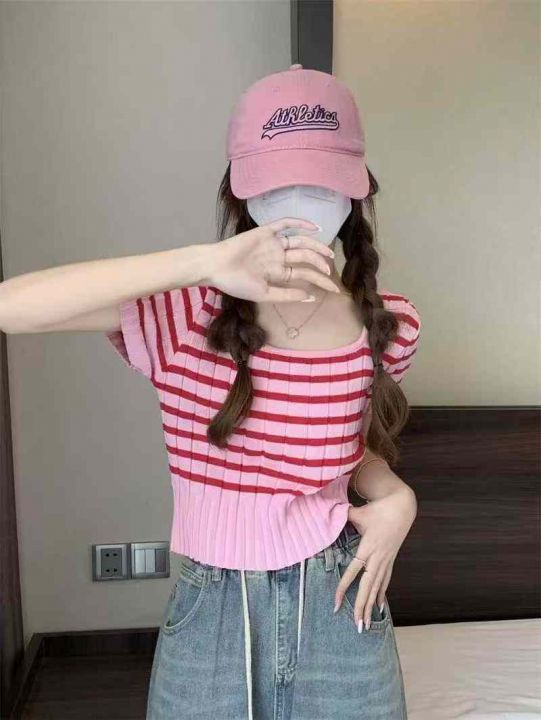 夏季新款撞色条纹甜美方领设计感短袖针织T桖,独立包装,均码面料柔软舒适...