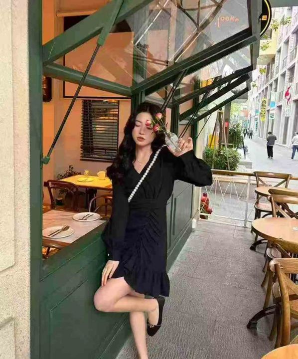 全清8.5抽褶不规则连衣裙2025年秋季新款遮肚显瘦v领长袖裙,142条,码数:M-...