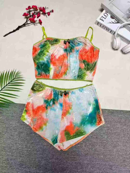6.5清欧美时尚性感金丝绒扎染斑纹吊带短裤两件套,数量700套左右,码数S-2X...