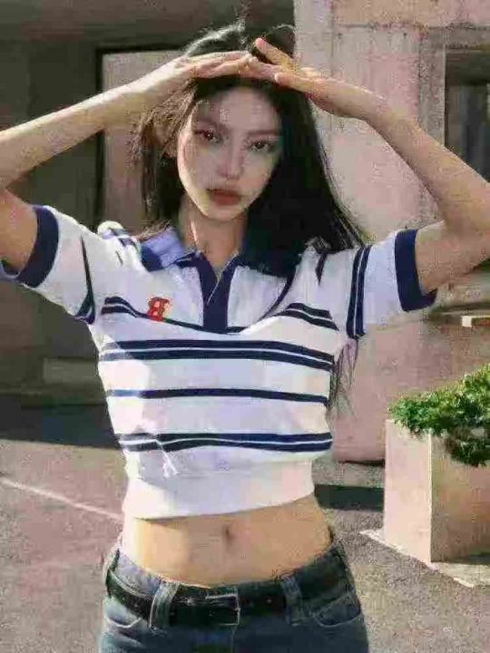全清价5.9元正肩短袖t恤女短款辣妹小众条纹翻领polo衫,独立包装,后领包边...