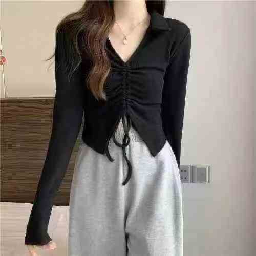 115件长袖t恤女辣妹炸街减龄v领polo针织衫内搭抽绳短款高腰露脐上衣潮,尺...