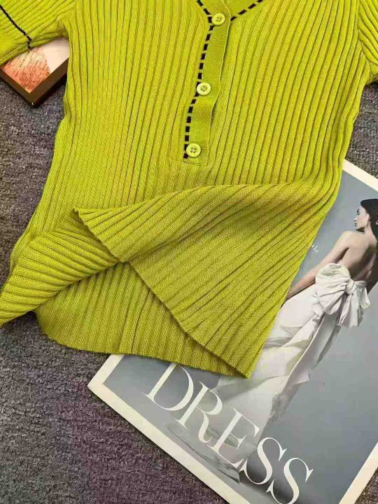 夏季新款薄款精纺V领小香风撞色弹力修身韩版半袖针织T桖,独立包装,面料软...