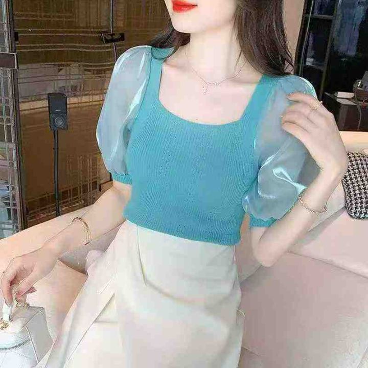 夏季新款时尚法式方领拼接泡泡袖弹力修身针织小衫,独立包装,均码面料柔软...