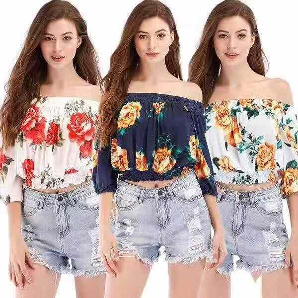 4.5清洋气花朵性感露肩一字领拉链短款开衫上衣,数量135件,码数S-2XL,整...