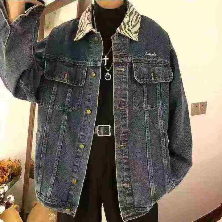 美式复古oversize斑马纹领牛仔外套男生秋季高街潮牌宽松工装夹克350件,独...