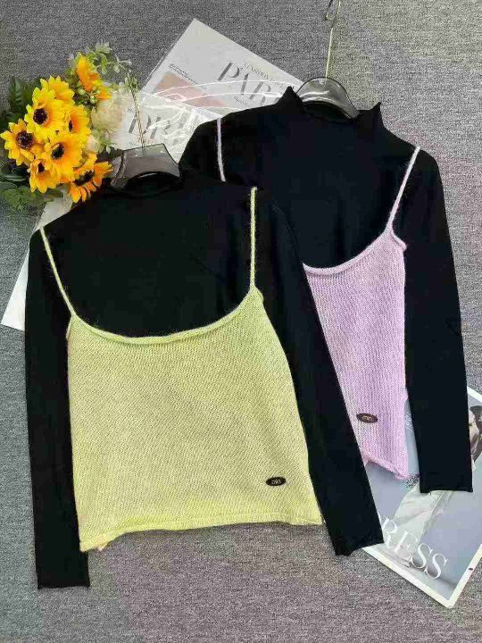 女装早秋新款复古港风chic叠穿v领针织吊带背心马甲+包芯纱套头毛衣2件套, ...