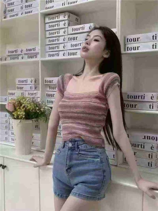 夏季新款方领撞色条纹简约复古文艺时尚减龄针织T桖,独立包装,均码面料软...