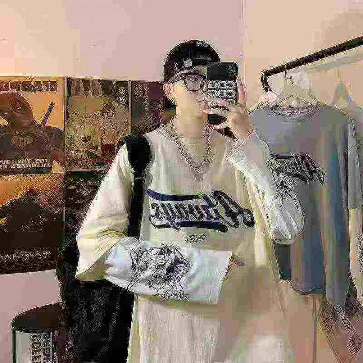 全清价5.9捡漏326件假两件长袖可爱图案t恤男潮牌嘻哈春秋棉T上衣,独立包装...