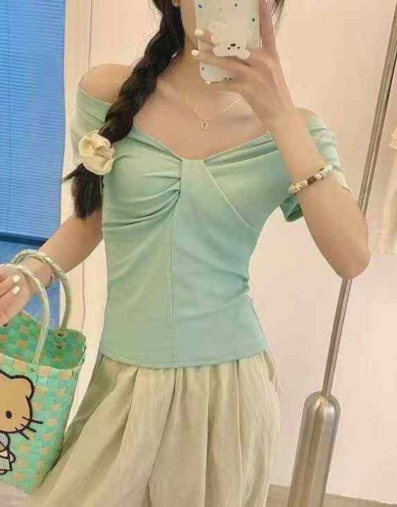 法式甜辣一字肩短袖125件5.8,面料舒适透气,有弹力,褶皱设计,码数1-4码...