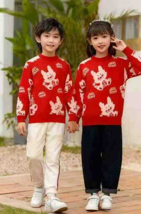 秋冬新款男女童中大童童装复古红色提花加厚包芯纱圆领套头毛衣,独立包装带...
