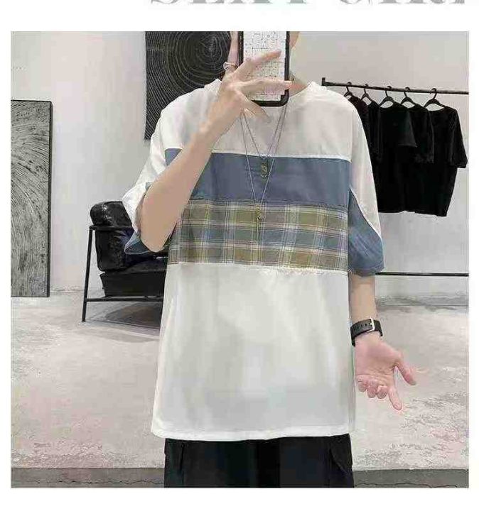 牛奶丝拼接短袖男ins潮百搭宽松港风t恤韩版潮流男生原宿五分袖潮牌半袖 341...