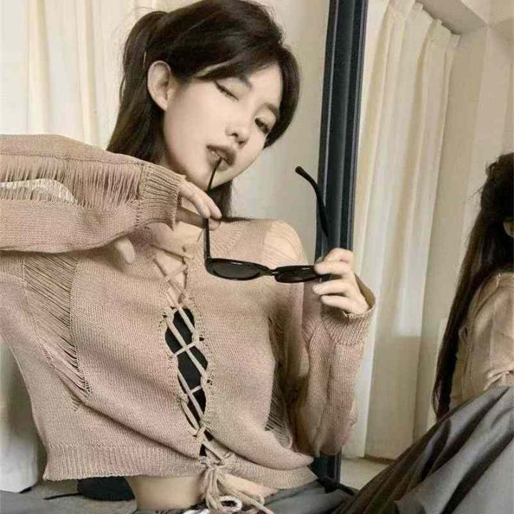 早秋新款纯欲风性感辣妹设计感绑带镂空两面穿针织长袖毛衣,独立包装,均码...