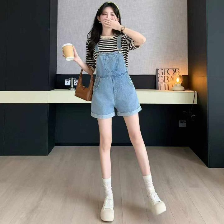 夏季新款撞色条纹针织T桖+洗水棉牛仔背带短裤2件套,独立包装,码数S--XL码...