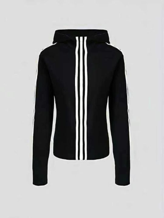 9.8分货➕12025春秋新款德绒连帽打底衫女休闲条纹三条杠长袖时尚显瘦女上衣...