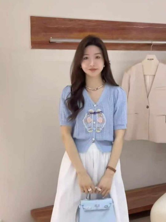 捡漏款,夏季新款国风复古刺绣v领短袖针织开衫,独立包装,均码面料柔软舒...