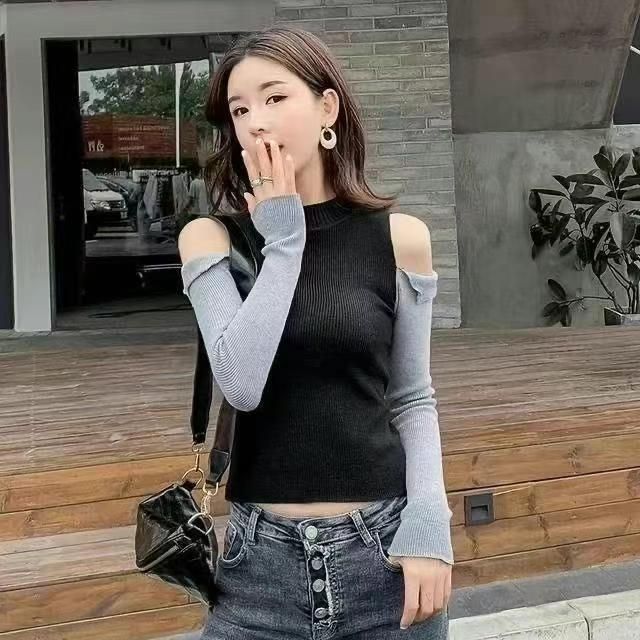 春季新款韩系设计感小众性感露肩长袖针织套头毛衣,独立包装红色为主,均码...