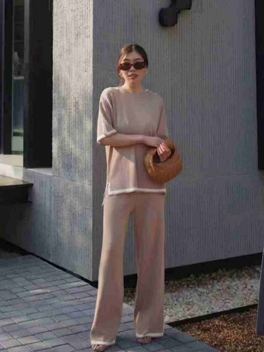 夏季复古慵懒风撞色宽松百搭针织上衣高腰显瘦长裤两件套女,码数S-XL码,面...