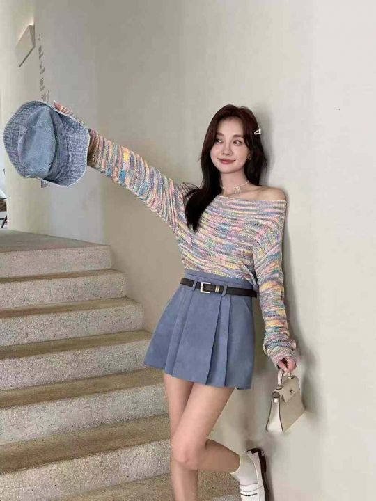 韩系慵懒复古长袖针织衫女春秋镂空套头一字肩毛衣上衣,独立包装,100件,...