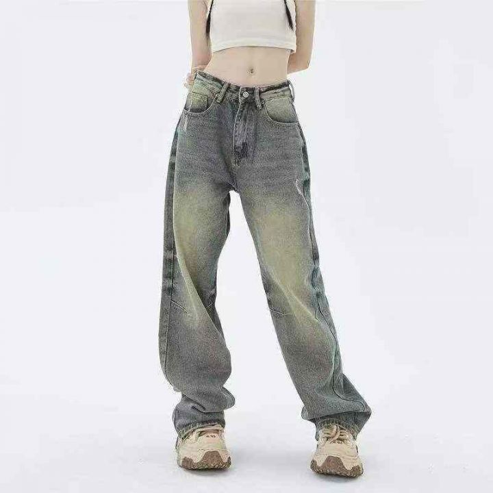 网红款简约复古刺绣直筒牛仔裤女高腰宽松显瘦拖地阔腿裤,单款单色,独立包...