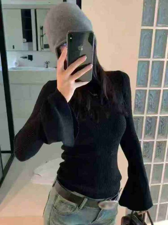 73件韩系靓妹款黑色圆领喇叭袖包芯纱针织衫女早秋小个子修身显瘦内搭气质打...