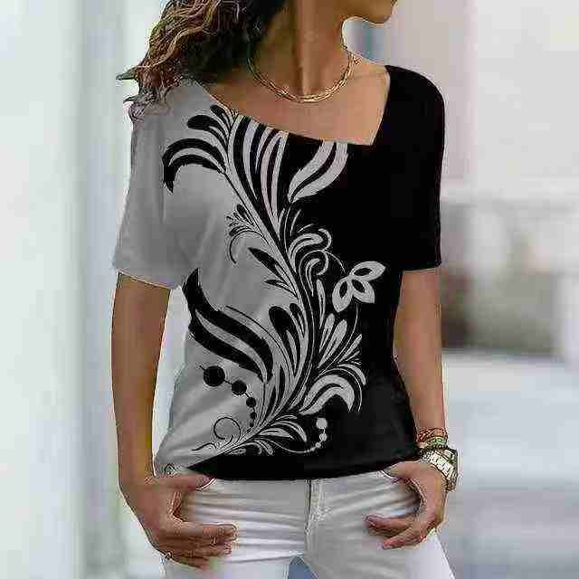 Printed Diagonal Neck Women\'s Short Sleeves印花斜领女式短袖码数:XL-...