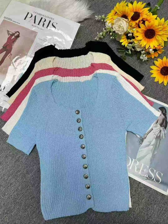 夏季新款纯欲甜辣妹设计感小众短款性感锁骨别致方领针织短袖开衫,独立包装...