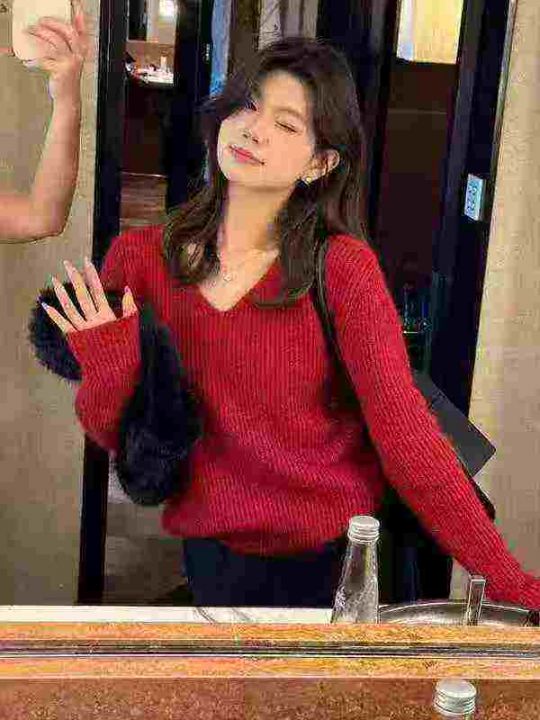 全清10.9,时尚气质慵懒风v领套头显瘦高端百搭毛衣圣诞红针织衫欧货上...