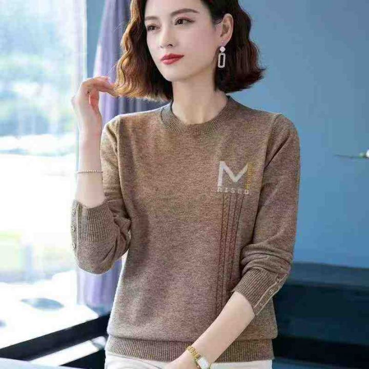 冬季加绒加厚字母提花设计款宽松慵懒风轻熟女装圆领套头毛衣,独立包装,均...