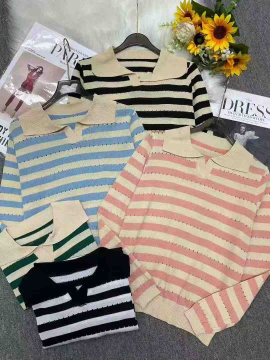 秋冬新款撞色条纹宽松百搭polo领针织套头毛衣,独立包装,均码面料柔软舒适...