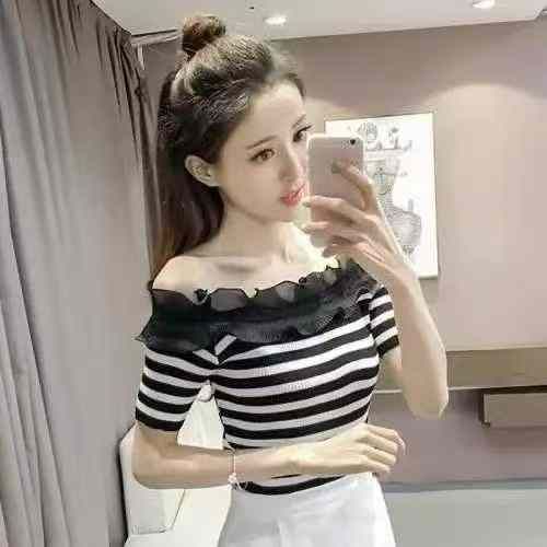 夏季新品时尚一字领套头短袖针织衫性感露肩休闲女装气质优雅。独立包装,34...