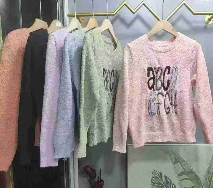 字母印花圆领套头毛衣女长袖春秋保暖打底小颗粒绒针织衫,独立包装,均码,...