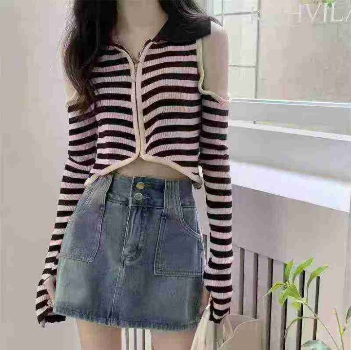 性感露肩条纹针织衫春秋高腰修身显瘦时尚翻领拉链开衫上衣,独立包装,均码...
