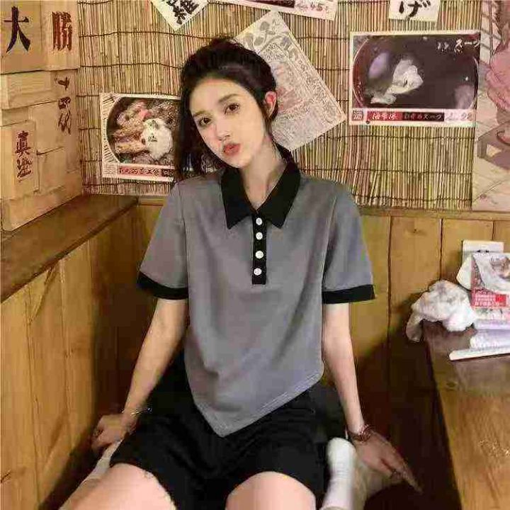 不规则polo领短袖T恤女夏季小个子短款显瘦女设计感甜美针织短袖上衣,独立...