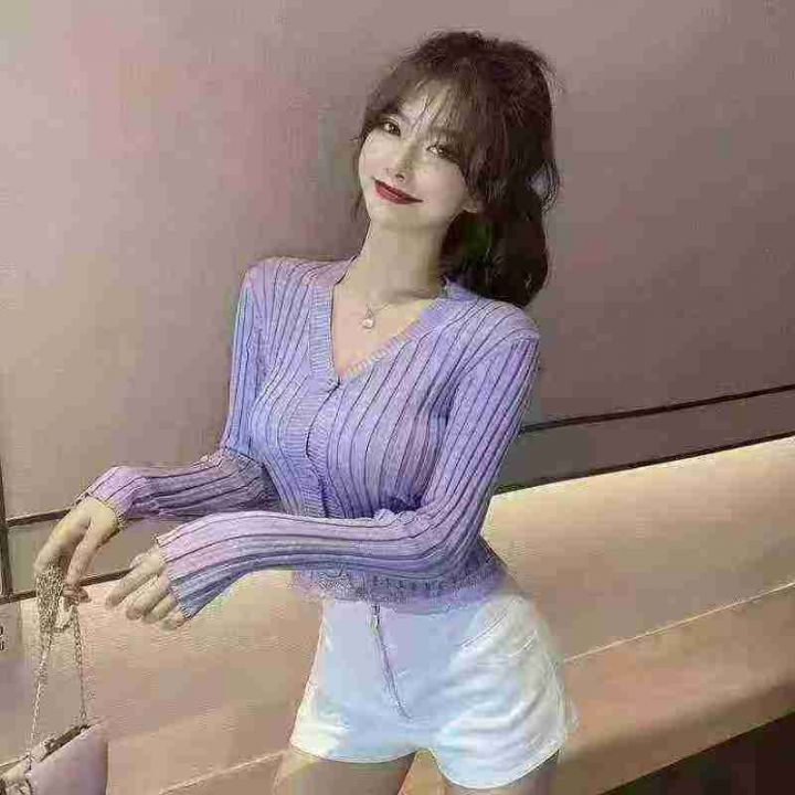 韩版2025chic长袖针织开衫女装外套毛衣春秋新款修身蕾丝边开衫,独立包装,...
