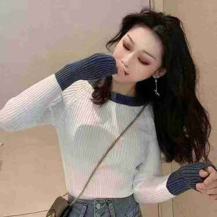 靓妹毛衣秋冬新款高弹力修身显瘦拼色圆领女士毛衣,独立包装,面料软糯弹力...